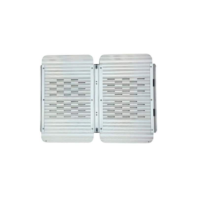 Disponible en dos anchos útiles (76 y 83 cm), esta rampa es compatible con todas las sillas de ruedas, scooters y ayudas técnicas. Se pliega longitudinalmente en dos, lo que facilita su transporte y almacenamiento, e incluye un asa suave y ergonómica (excepto en las versiones más largas).
