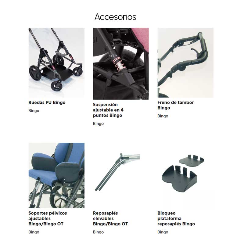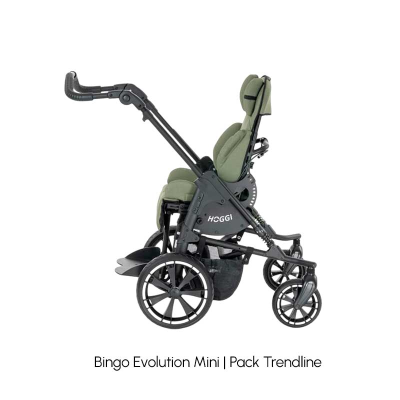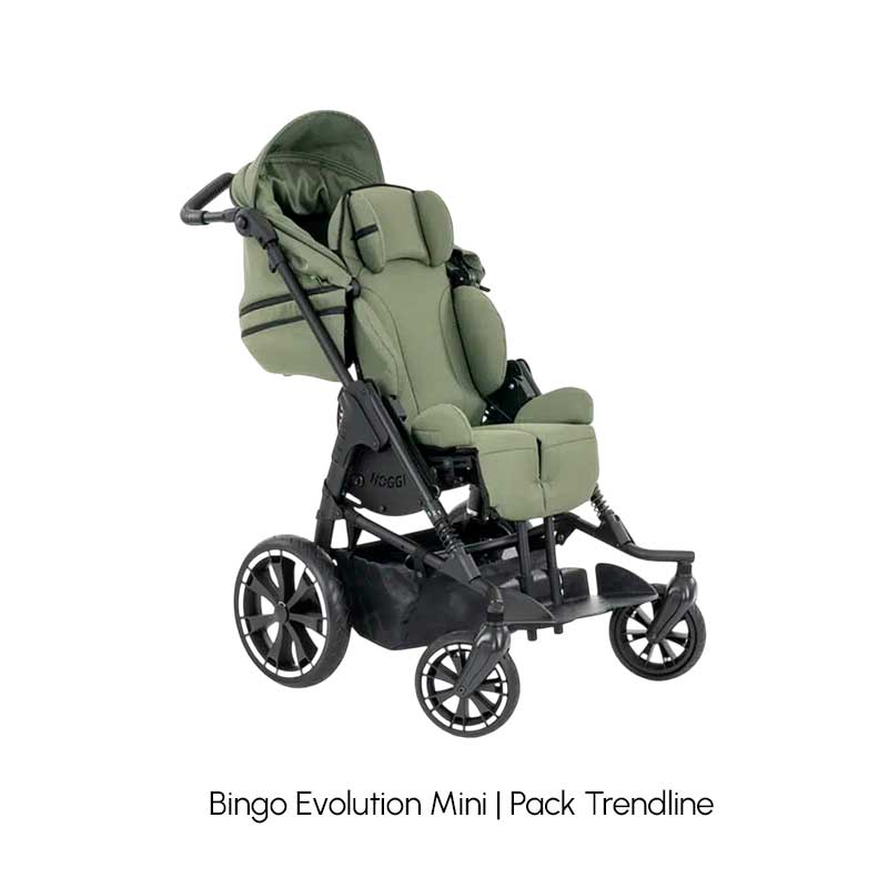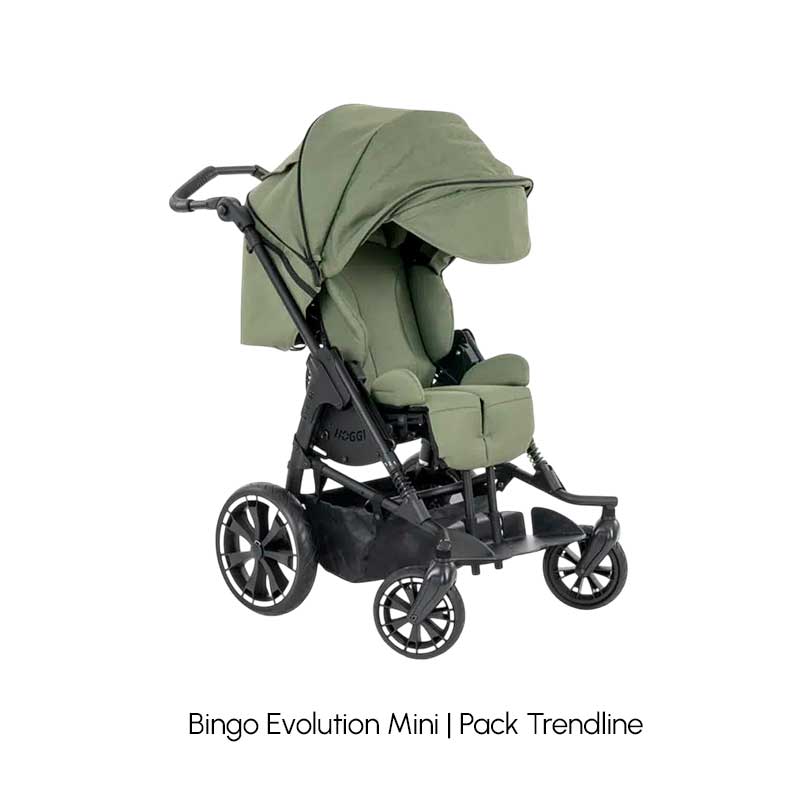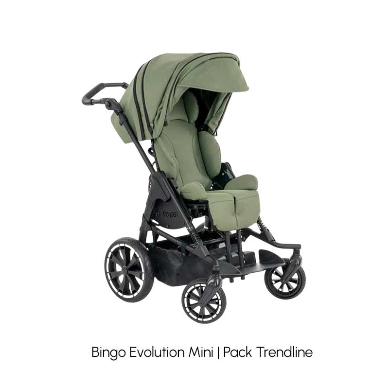 Su diseño compacto y estético facilita el uso diario de las familias y garantiza la maniobrabilidad incluso en espacios reducidos. La base móvil del chasis permite conservar la inversión a medida que el niño crece, utilizando la siguiente unidad de asiento (talla 1). Además, la amplia gama de accesorios (como soportes pélvicos y de cabeza, reposapiés elevables, barras terapéuticas, capotas y sacos de invierno) convierte al Bingo Evolution en un cochecito adaptable a cada necesidad.