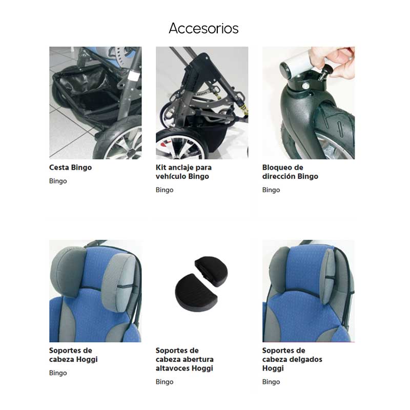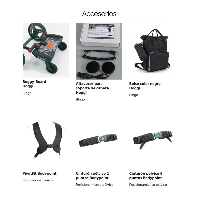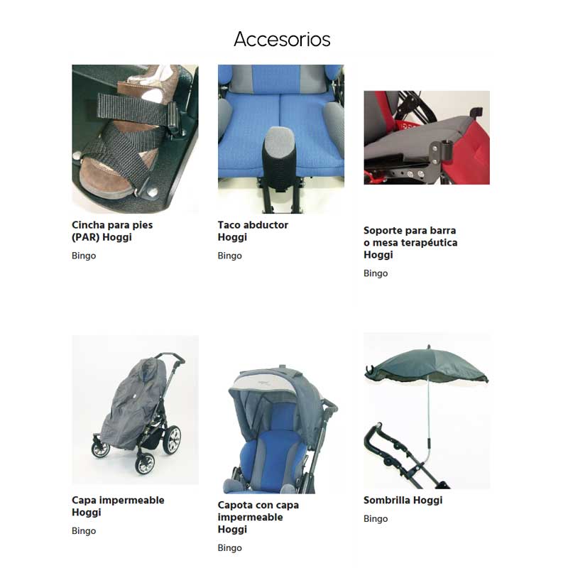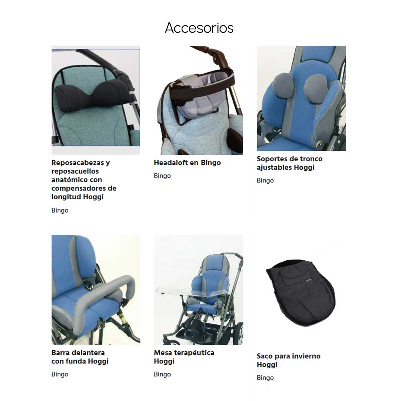 • Amplia gama de accesorios: soportes pélvicos y de cabeza, reposapiés, barras terapéuticas, capotas y sacos de invierno
