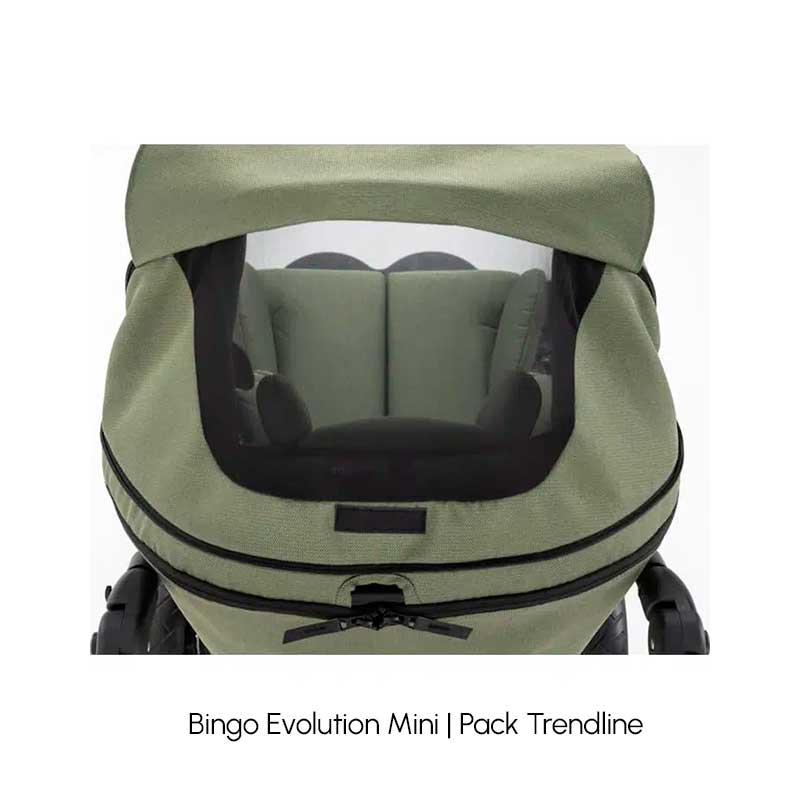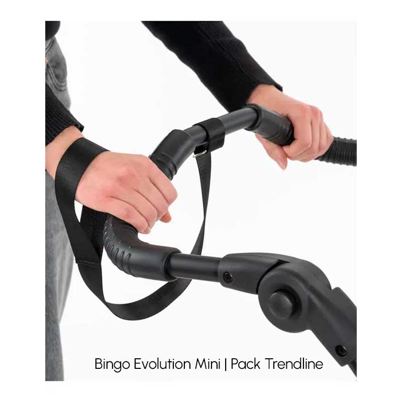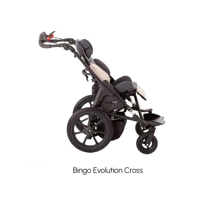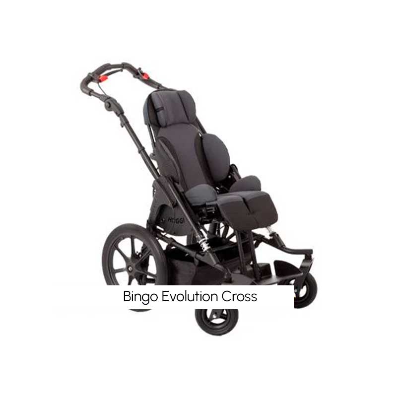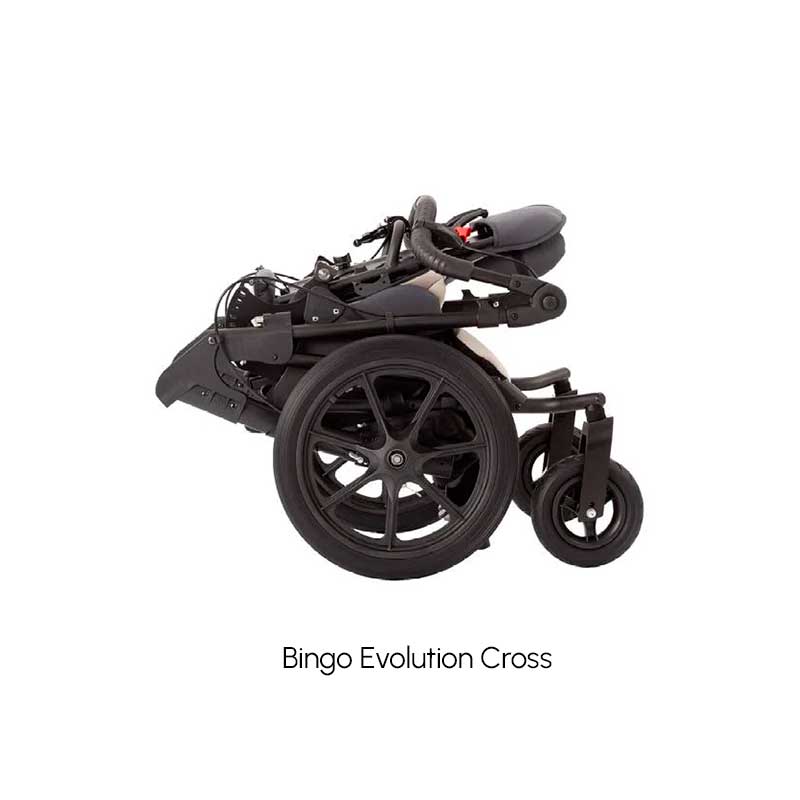La versión Bingo Evolution Mini Cross está especialmente pensada para terrenos irregulares, incorporando ruedas más grandes de 16” y freno de tambor, asegurando estabilidad y maniobrabilidad en cualquier entorno. Ambos modelos cuentan con un diseño robusto, compacto y fácil de plegar, además de una amplia gama de accesorios que permiten adaptar el cochecito a las necesidades individuales de cada usuario.