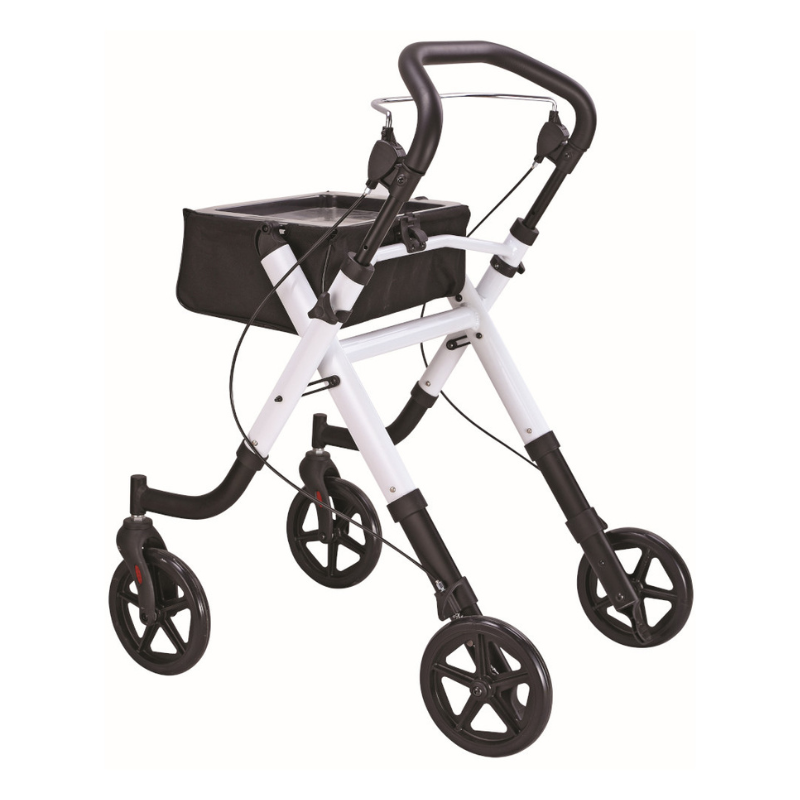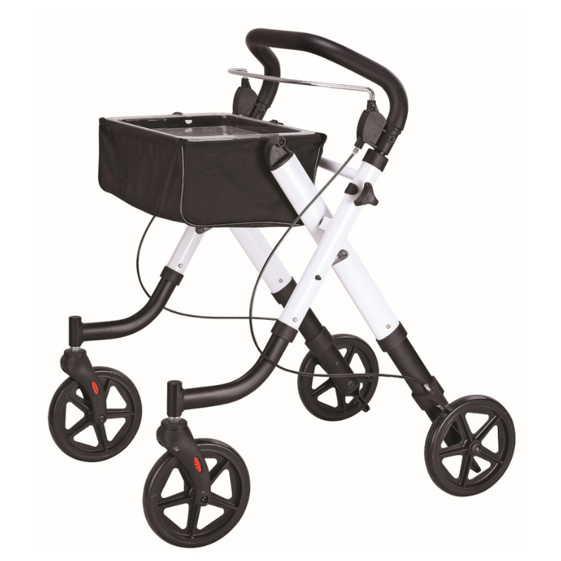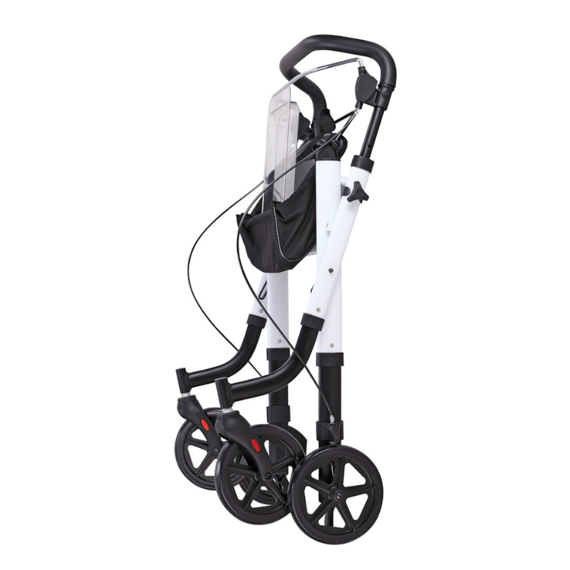 Gracias a su estructura de aluminio plegable, el rollator es extremadamente ligero (6,6 kg), lo que permite transportarlo fácilmente o guardarlo en espacios reducidos. Sus ruedas de 20 cm de diámetro aseguran un desplazamiento fluido sin necesidad de levantar el andador, reduciendo el esfuerzo físico y favoreciendo la independencia del usuario.