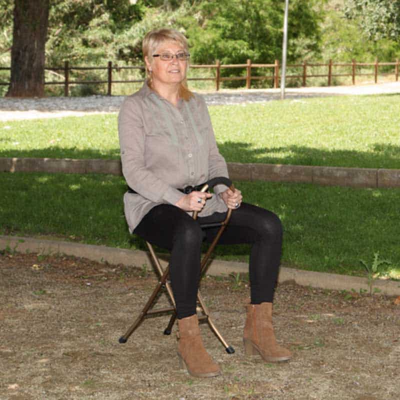 - Uso: bastón de apoyo y asiento portátil
