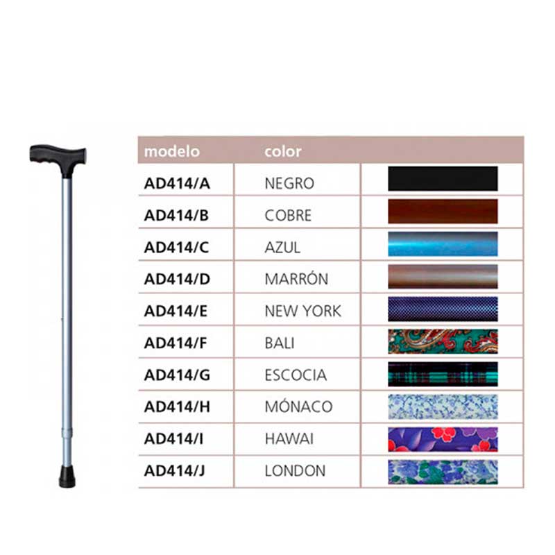 Disponible en una amplia variedad de modelos y colores (negro, cobre, azul, marrón, New York, Bali, Escocia, Mónaco, Hawai y London), el bastón AD414 se adapta a todos los estilos y preferencias personales.